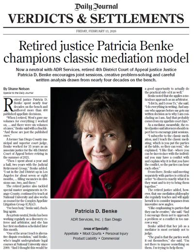 Retired justice Patricia D. Benke spent nearly four decades on the bench and authored more than 400 published appellate decisions. "When I retired, West's gave me volumes for everything I worked on, ...and there were six volumes of cases," Benke said with a chuckle. "And those are just the published ones."